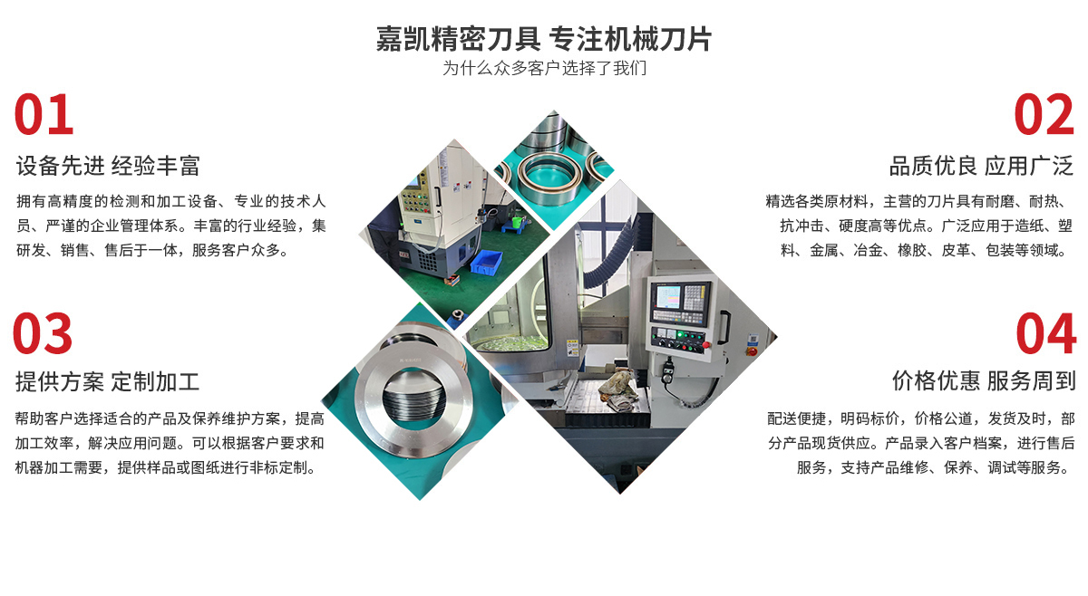 - 馬鞍山市嘉凱精密刀具科技有限公司主營各類機械刀片,產品銷往各大中型鋼廠、造紙、冶金、化工、紡織、電子、藥材、木工、園林、食品、橡膠輪胎廠,以及各種包裝行業。 我們致力于以產品質量贏得市場,崇尚質量至上的思想,制定了嚴格的質量把控措施,實行“質量買斷制”、“質量責任追究制”、和“產...